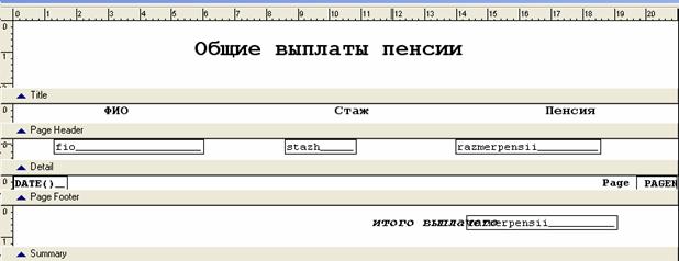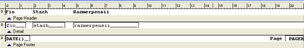 Выбираем поля fio из table1, stazh из table2 и razmerpensii из table2. возвращаемся в Быстрый отчет и жмем ОК. Автоматически будут размещены объекты в конструкторе, остается их только отредактировать. Первоначальный вид отчета отображен на рисунке 2.7.2.3.