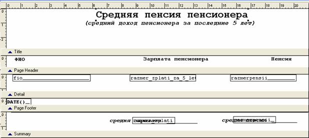 Создание отчета Справка пенсионеру, а также отчет Средняя пенсия пенсионера аналогично всем действиям создания предыдущего отчета - Общие выплаты пенсии. Отчет в виде modify (изменения) отображен на рисунке 2.7.2.5.