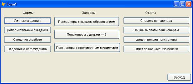 Создание главной кнопочной формы схоже с созданием обычной формы через конструктора форм. В создании использовались такие компоненты как Кнопки (Command button), Метки (Label). Вид главной кнопочной формы отображается на рисунке 3.1