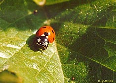 Врагом тлей является наша обычная семиточечная коровка (Coccinella septempunctata, табл. 39, 30), имеющая на красных надкрыльях семь черных точек. Снизу жук черный, его передyеcпинка также черная с двумя белыми пятнами (см. фото). Зимуют взрослые жуки, и уже в первые теплые дни они пробуждаются от оцепенения и приступают к поискам зарождающихся колоний тлей. Их серые с красными точками личинки очень прожорливы, для полного развития им необходимо около 1000 тлей, причем дневной рацион взрослой личинки состоит из 60 —100 взрослых тлей или 300 личинок. Семиточечная коровка встречается в течение всего лета, а осенью жуки отправляются па зимовку. Руководствуясь запахом, они слетаются вместе и образуют крупные скопления в листве на опушках леса или под камнями в горах, обычно на южных прогреваемых склонах. Образ жизни большинства кокцинеллид сходен.