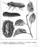Личинки похожи на жирные запятые, покрыты слизистыми выделениями; питаются мякотью листьев, оставляя лишь жилки и прозрачную пленку нижней кожицы. Поврежденные листья подсыхают, сильно пострадавшие деревья кажутся обожженными. Выкормившиеся личинки уходят в почву.