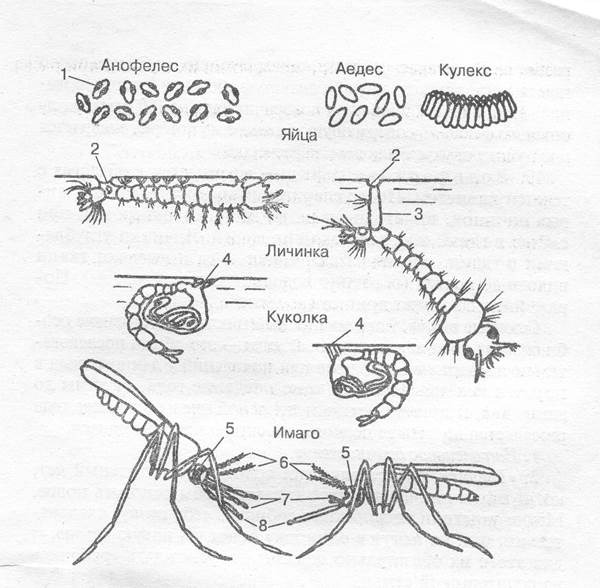 Малярийный комар (Anophelesmaculipennis) – служит специфическим переносчиком возбудителя малярии. Самцы и молодые самки питаются растительными соками, а после спаривания самки начинают пить кровь, которая необходима для развития яиц. Самки нападают на человека, домашних и диких животных. После созревания яиц самки мигрируют к водоему. Отличием от других комаров является то, что анофелес откладывает яйца вразброс, не приклеивая их друг к другу. Яйца имеют воздушные камеры и плавают на поверхности воды. Через несколько дней из яиц вылупляются личинки, дышащие воздухом. При дыхании их тело располагается параллельно поверхности водоема, а воздух поступает в трахею через дыхальца, в то время как у комаров Aedes и Culex воздух поступает через сифон. Именно по форме дыхательного сифона можно отличить куколку малярийного комара от обыкновенного: у куколки малярийного комара он имеет форму конуса. У взрослых особей различия проявляются в строении придатков головы, окраске крыльев и посадке. У самок анофелес нижнечелюстные щупики равны по длине хоботку; на крыльях расположены мелкие темные пятна; а брюшко у сидящего комара приподнято и находится под углом к поверхности.