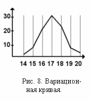 Знание нормы реакции имеет большое значение для практики сельского хозяйства Модификационная изменчивость многих признаков растений, животных и человека подчиняется общим закономерностям. Эти закономерности выявляются на основании анализа проявления признака у группы особей. Каждое конкретное значение изучаемого признака называют вариантой и обозначают буквой v. Частота встречаемости отдельных вариант обозначается буквой p. При изучении изменчивости признака в выборочной совокупности составляется вариационный ряд, в котором особи располагаются по возрастанию показателя изучаемого признака. На основании вариационного ряда строится вариационная кривая - графическое отображение частоты встречаемости каждой варианты (рис. 8).