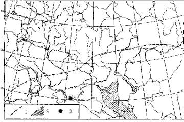 Рис. 1. Гнездовой ареал розового скворца в Восточной Европе по данным Е.П. Спангенберга (1954) и в настоящее время (Костин, 1983; Белик, 1993 и др.): 1 — северная граница ареала в первой половине XX в.; 2 — предельная граница пульсации ареала в 1980-е гг.; 3 — место постоянного гнездования в Крыму.