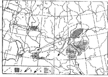 Рис. 6. Структура ареала дрофы в Восточной Европе и основные районы дератизационных работ в Прикаспии: 1 — границы современных гнездовий дрофы, 2 — популяционные ядра важнейших гнездовых группировок, 3 — пути миграций на зимовки, 4 — исчезнувшие миграционные пути, 5 — районы массовой борьбы с грызунами в Прикаспийских очагах чумы.