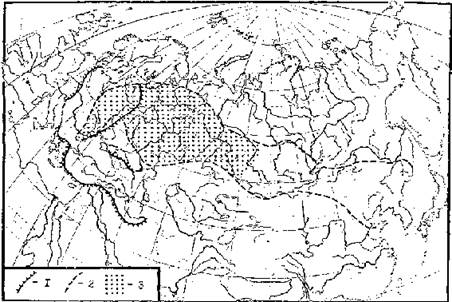 Рис. 7. Гнездовые ареалы подорликов Aquila clanga и A. p. pomarina (внизу), структура ареала водяной полевки (вверху) и распространение природных очагов туляремии в Северной Евразии (посредине) (по: Дементьев, 1951; Неронов, 1965; Олсуфьев, Дунаева, 1970 и др.). Ареалы: 1 — A. p. pomarina, 2 — A. clanga, 3 — исчезающих популяций большого подорлика. Численность водяной полевки: 1 — высокая, 2 — средняя, 3 — низкая; а — стабильная, б — нестабильная. Распространение туляремии: 1 — территории, занятые природными очагами; 2 — границы провинций очаговости.