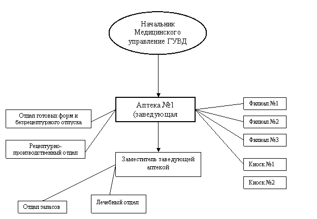 Рассматривается деятельность руководителя (заведующей) Аптеки №1 ГУВД г. Москвы, который находится в промежуточной области иерархии кампании, то есть имеет, как непосредственных начальников, так и подчиненных. Иерархическая структура данной организации (Аптеки №1 ГУВД) представлена в схеме 1.