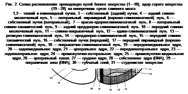 Обе половины спинного мозга соединены между собой промежуточным центральным веществом — серыми и белыми спайками В сером веществе спинного мозга различают симметричные передние и задние столбы. На участке от I грудного до II поясничного сегментов имеются еще боковые столбы. На поперечном сечении спинного мозга столбы называются соответствующими рогами: