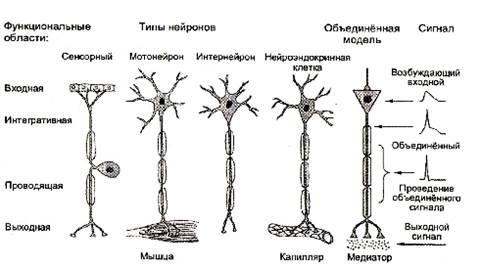 Таким образом, входные сигналы представлены двумя разновидностями местных потенциалов, рецепторным и постсинаптическим, а возникают эти потенциалы в строго определенных областях нейрона: либо в чувствительных окончаниях, либо в синапсах. Чувствительные окончания принадлежат сенсорным нейронам, где рецепторный потенциал возникает под действием каких-либо раздражителей, внешних по отношению к нейрону стимулов. Для интернейронов, а также для эфферентных нейронов входным сигналом может быть только постсинаптический потенциал.