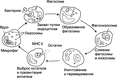 После поглощения чужеродного микроорганизма фагоцитом он оказывается в ловушке внутриклеточного пузырька, который называется фагосомой. Фагосома сливается с другим пузырьком - лизосомой, в результате чего формируется фаголизосома. Микроорганизм погибает под воздействием пищеварительных ферментов, либо в результате дыхательного взрыва, при котором в фаголизосому высвобождаются свободные радикалы. Фагоцитоз эволюционировал из способа получения захвата питательных веществ, но эта роль у фагоцитов была расширена, став защитным механизмом, направленным на разрушение патогенных возбудителей. Фагоцитоз, вероятно, представляет собой наиболее старую форму защиты макроорганизма, поскольку фагоциты обнаруживаются как у позвоночных, так и у беспозвоночных животных.