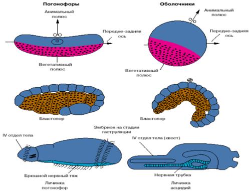 Рис. 4. Особенности эмбрионального развития погонофор и низших хордовых.