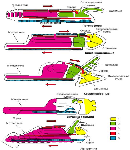 Рис. 5. Сравнение планов строения различных групп вторичноротых (личинка асцидий и ланцетник изображены в перевернутом положении). 1 - целомы первой пары, 2 - целомы второй пары, 3 - целомы третьей пары, 4 - кровеносная система, 5 - нервная система. Стрелки показывают направление тока крови.