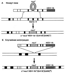 Рис. 4. Действие системы позитивной – негативной селекции: А) интеграция вектора в нужный участок генома, приводящая к нокауту гена, Б) случайная интеграция (синтез тимидин-киназы и гибель клеток) [19].