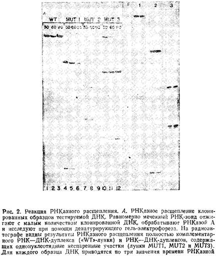 Единичные нуклеотндные замены во фрагментах геномной ДНК можно обнаружить при расщеплении неспаренных участков в РНК-ДНК-дуплексах, обрабатывая эти дуплексы РНКазой А. Рис. 1 иллюстрирует последовательные этапы процедуры.