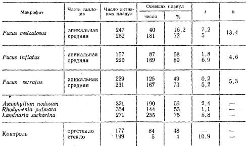 Планулы G. loveni активнее оседали на слизистый слой с поверхности водорослей, чем на стерильное дно контрольных сосудов: на пленку F. inf latus — в 20 раз активнее, F. vesiculosus и F. serratus — в 18, L. sacharina — в -19, A. nodosum — в 15 раз (табл. 1). Интенсивность оседания личинок на водорослевые субстраты возрастала в ряду R. palmata, A. nodosum, F. vesiculo&us, F. serratus, L. sacharina, F. in-flatus (табл. 1).