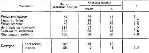 Согласно полученным нами сведениям, оседание планул G. loveni и L. flexuosa на слизистый слой макрофитов достоверно отличается от оседания на оргстекло с вероятностью 99%, равно как отличается оседание на пленку со средней части талломов от оседания на пленку с апикальных участков макрофитов.