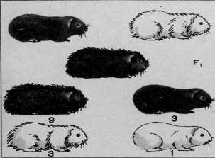 Ход дигибридного скрещивания можно показать и на примере животных. На рисунке 1 изображено дигибридное скрещивание двух пород морских свинок: черных гладких с белыми мохнатыми. В данном случае черная окраска доминирует над белой, мохнатая шерсть — над гладкой. Из рисунка без дальнейших пояснений ясен ход скрещивания, который совершенно аналогичен рассмотренному дигибридному скрещиванию горохов.