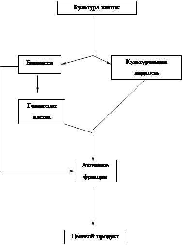 Схемы выделения целевого продукта в биотехнологическом производстве существенно различаются в зависимости от того, накапливается продукт в клетке или он выделяется в культуральную жидкость, или же продуктом является сама клеточная масса (общая схема выделения на рис 1). Наиболее сложно выделение продукта, накапливающегося в клетках. Для этого клетки необходимо отделить от культуральной жидкости, разрушить (дезинтегрировать) и далее целевой продукт очистить от массы компонентов разрушенных клеток. Выделение продукта облегчается, если он высвобождается (экскретируется) продуцентом в культуральную жидкость.