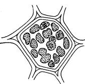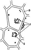 Лейкопласты в эпидермисе листьев традесканции: 1— лейкопласты; 2—ядро; 3— оболочка