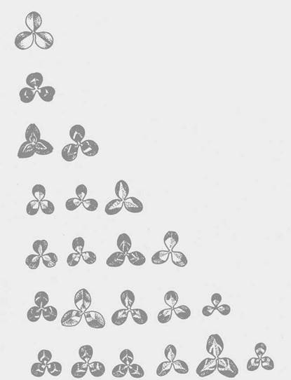 Во многих случаях попарные взаимодействия членов серии аллелей приводят к тому, что исследуемый признак проявляется иначе, чем у гомозиготных родительских форм. В качестве примера можно привести наследование узора на листьях белого клевера (рис. 1). На рисунке показаны формы, гомозиготные по различным аллелям гена V (по вертикали), и формы, несущие разные сочетания этих аллелей.