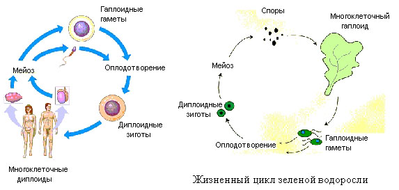 Например, жизненный цикл человека вы знаете из школьного курса биологии. У человека диплоидный набор хромосом (23 пары), в гаплоидной стадии образуются половые клетки (сперматозоиды и яйцеклетки), в которых только 23 хромосомы, эта стадия проходит недолго, после оплодотворения получается опять диплоидный организм.
