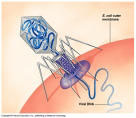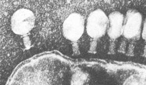 Ниже представлена фотография «нападение бактериофагов на кишечную палочку». Бактериофаг впрыскивает внутрь кишечной палочки свою ДНК, вследствие чего в бактерии синтезируются белки бактериофага и проиходит сборка фаговых частиц. Сама бактерия при этом погибает.