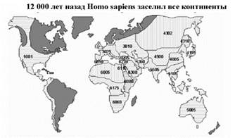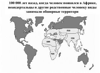 Более 100 000 лет назад человек современного типа появился на территории Африки, а затем расселился по всей Земле, позже всего он проник в Америку – около 15 тыс. лет назад. Родственные виды (неандерталец и другие виды), которые проживали в Африке, Европе и Азии, исчезли, видимо, не без участия человека.