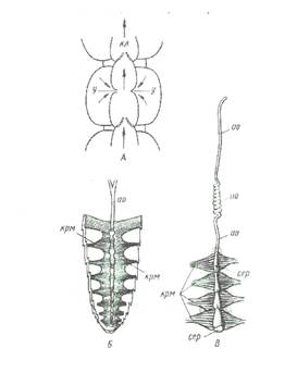 (по Г.Я. Бей-Биенко, 1980): А – схема расположения клапанов при движении крови златогузки; Б – спинная стенка тела; В – спинной сосуд; кл – клапан, у – устице, ао – аорта, сер – сердце, крм – крыловидные мышцы [3].