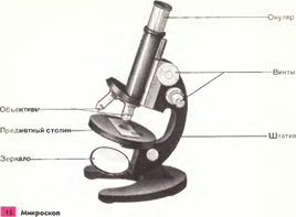 Главная часть светового микроскопа, с которым вы работаете в школе,— увеличительные стекла, вставленные в трубку, или тубус (по-латыни «тубус» значит «трубка»). В верхнем конце тубуса находится окуляр, состоящий из оправы и двух увеличительных стекол. Название «окуляр» происходит от латинского слова «окулус», что значит «глаз». Рассматривая предмет с помощью микроскопа, глаз приближают к окуляру.