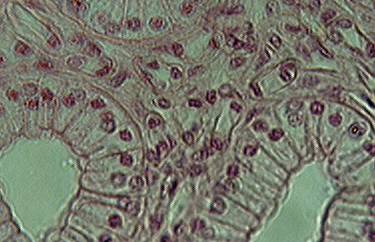 При увеличении 200х выбирают участок микропрепарата с хорошо различными клетками канальца. Ядра этих клеток крупные, расположены приблизительно в центре или ближе к базальной части клетки. Базальные концы эпителиальных клеток обращены к соединительной ткани и расположены на так называемой базальной мембране. Противоположные (апикальные) концы клеток, обращены в просвет канальца и скреплены замыкательными пластинками, которые препятствуют проникновению тканевой жидкости из канальцев в межклеточное пространство рыхлой соединительной ткани.
