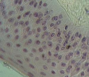 Клетки микропрепарата окрашены розовым цветом, ядра сиреневым. При изучении микропрепарата обращают внимание на форму клеток, их тесное соприкосновение. Микропрепарат рассматривают под микроскопом при увеличении 80х и 200х.
