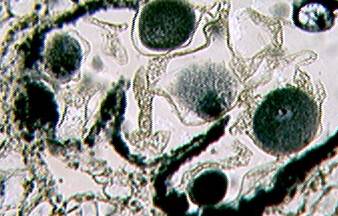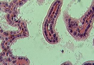 На микропрепарате находят группы светло окрашенных секреторных отделов, имеющих форму округлых или вытянутых мешочков. От них в сторону просвета отходят узкие эпителиальные трубки - выводные протоки.