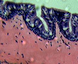 На микропрепарате «Высокий призматический эпителий почки кролика» при увеличении 200х наблюдают однослойный высокопризматический железистый эпителий. Обращают внимание на форму клеток и их тесное соприкосновение. Это высокие и узкие цилиндрические клетки. Благодаря такой форме на единицу площади эпителия приходится больше цитоплазмы. В каждой клетке наблюдают ядро, расположенное ближе к базальной части клеток. Базальные концы эпителиальных клеток обращены к соединительной ткани и расположены на базальной мембране. Противоположные (апикальные) концы клеток, обращены в просвет канала. Цилиндрический эпителий выстилает стенки желудка; слизь, выделяемая железистыми клетками, защищает слизистую желудка от воздействия его кислого содержимого и от переваривания ферментами.