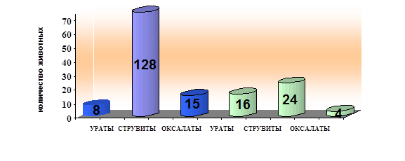 Уролитиаз, сопровождающийся инфекцией, регистрировали у кошек в 58 пробах урины из 151, при чем, на долю струвитов пришлось 86,2%, оксалатов - 8,6%, уратов -5,2%. Наибольшая инцидентность инфицирования урины отмечена у самцов - 75,8% (коты – 51,7%, кастраты – 24,1%) (р ≤ 0,01).
