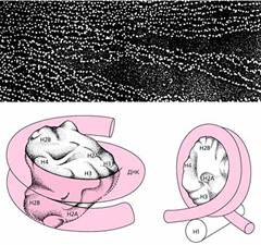 На фотографии хроматин виден как нить с нанизанными на нее бусинками. Ядро нуклеосомы, или минимальная нуклеосома, состоит из восьми молекул гистонов - по две молекулы каждого вида: Н2А, Н2В, Н3 и Н4. Этот октамер обвит сегментом ДНК, делающим вокруг ядра 1.75 оборота (внизу слева), а гистон-1 (Н1) в полной нуклеосоме “сшивает” ДНК в начале и в конце обвитого сегмента (внизу справа).