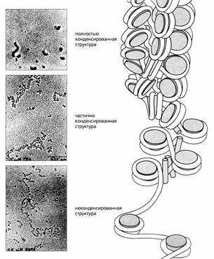 В растянутой форме (нижняя часть рисунка) хроматин имеет вид нити с бусинками-нуклеосомами. За счет гистона-1 (Н1) он частично уплотняется, конденсируется (в середине), а затем конденсируется полностью (механизм остается неизвестным), и гены в этой части ДНК совершенно неактивны.