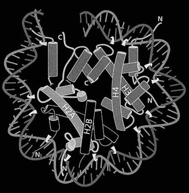 Показана половина нуклеосомы с одним витком суперспирали (73 пары оснований) и четырьмя молекулами гистонов (Н2А, Н2В, Н3, Н4). Их спиральные сегменты изображены в виде цилиндров, неструктурированные участки между ними - в виде петель, буквами N и С обозначены “хвосты”, т.е. аминные и карбоксильные концы молекул. Места, в которых ДНК контактирует с гистонами, указаны белыми крюками.