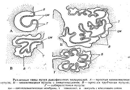 Пузулы. Большинство монадных динофитовых водорослей обладает вместо отсутствующих пульсирующих вакуолей особой органеллой — пузулой. Пузула представляет собой инвагинацию цитоплазматической мембраны в форме мешка или трубки, глубоко вдающуюся внутрь клетки и непосредственно соприкасающуюся с вакуолью клеточного сока. Вакуоль окружает пузулу, стенка которой становится таким образом двух-мембранной. Пузулы изливают свое содержимое наружу через жгутиковые каналы. В случае крупной мешковидной пузулы поверхность контакта между плазмалеммой и тонопластом увеличивается благодаря инвагинациям разветвлений вакуоли внутрь пузулы. То же относится и к трубковидным пузулам. Если приходящее в контакт с вакуолярной системой впячивание плазмалеммы сообща-