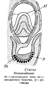 Глазки, расположенные вне хлоропластов у основания жгутиков, также отличаются большим разнообразием: от простейшего глазка в виде массы глобул {Woloszynskia coronata) до сложной светочувствительной органеллы, состоящей из стекловидной, преломляющей свет линзы и пигментного тела, например у рода эритропсис. У нематодиниума стигма тоже состоит из прозрачного линзовидного тела, окружающей его снизу пигментной чашечки и расположенного на дне этой чашечки светочувствительного ретиноидного тела. Линза точно фокусирует свет на дне пигментной чашечки. С физической точки зрения была доказана возможность получения изображения объекта на ретиноидиом слое.