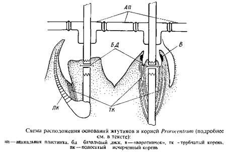 Представителем может служить преимущественно морской род пророцентрум, иногда размножающийся столь обильно, что вызывает цветение прибрежных вод. Клетки более или менее овальные, с боков несколько уплощенные, лишены ложбинок или бороздок. Две главные пластинки тек блюдцевидные, смыкаются вдоль всего края, за исключением их переднего конца, где в одной из них имеется выемка. В апикальной обласги располагается ряд мелких толстых пластинок, довольно прочно соединенных друг с другом так, что апикальная структура имеет тенденцию отделяться как одно целое. От апикальных пластинок отходит и характерный для рода апикальный шип, или зубец,— трубчатая или сдвоенная структура. Главные текальные пластинки гладкие или орнаментированные, перфорированы рядом трихоцистных пор. На переднем конце клетки имеются два жгутика, выходящие через индивидуальные каналы в апикальных пластинках. Один жгут направлен вперед, превышает по длине клетку, имеет заостренный конец и, по-видимому, не несет волосков. Второй жгут, несмотря на то что клетка лишена каких-либо следов поперечной борозды, свойственной монадным клеткам динофициевых водорослей, является по структуре типичным «поперечным» жгутом. Он закручен и внутри свободной мембраны, помимо аксонемы, содержит исчерченный тяж; мембрана его несет односторонний ряд мелких волосков. Основания жгутов в отличие от динофлагеллят параллельны друг другу и располагаются каждое в цитоплазматическом выступе в полости под текой. При вхождении жгутика в цитоплазматический выступ находится толстый трехслойный базальный диск, замыкающий центр аксонемы, под которым периферические дублеты превращаются в триплеты. Оба жгутика различаются по расположению и структуре своих корней. Один жгутик в месте выхода из цитоплазмы имеет «воротничок», и несколько микротрубочек тянутся от основания жгутика к «воротничку». У другого жгута проксимальный конец базального тела заключен в электронно-плотный материал, от которого отходят вперед трубчатый корень и корень с поперечной исчерченностью.