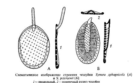 Род синура (Synura) характеризуется шаровидными или эллипсоидальными колониями из грушевидных клеток, задними, иногда очень длинными концами соединяющимися в центре колонии. Кнаружи от цитоплазматической мембраны клетки одеты спирально расположенными, черепитчато перекрывающими друг друга окремнелыми чешуйками, форма и ультраструктура которых, как и в случае малломонас, имеют важное таксономическое значение. Например, у S. sphagnicola базальная пластинка на поперечном срезе имеет одинаковую толщину, т.е. плоская. Она пронизана мелкими перфорациями. Передний край снабжен утолщенной апикальной кромкой, базальный край загнут, окружая базальную пластинку наподобие скобы. Полый отогнутый наружу шип прикреплен несколько отступя от переднего края пластинки, у основания его находится пора. Чешуйки других видов, например S. peterscnii, сложнее. Поверх базальной мелко перфорированной пластинки располагается полый медиальный гребень – апикальный, заостренный или тупой, конец которого может выступать за фронтальный край чешуйки, имитируя шип. В передней части медиального гребня находится крупная пора. Базальный конец чешуйки подковообразно загнут и нависает над телом чешуйки. Передние и задние чешуйки, покрывающие тело клетки, несут поперечные ребра, отходящие от медиального гребня, срединные чешуйки, помимо поперечных, имеют еще продольные ребра. Чешуйка не лежит на клетке плоско, а по-видимому, прикреплена только концом, противоположным шипу. Профили чешуек тела у S. sphagnicola можно наблюдать в цитоплазматических везикулах, большей частью расположенных вблизи наружной поверхности хлоропласта или между хлоропластом и везикулами с хризоламинарином.