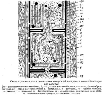Цитология. При рассматривании клетки сине-зеленых водорослей в оптическом микроскопе можно видеть, что окруженная оболочкой цитоплазма, как правило, лишена вакуолей с клеточным соком, окрашена в периферических частях и бесцветна в центре. Резкой границы между хроматоплазмой и центроплазмой нет. В центроплазме локализирована ДНК, что позволяет рассматривать ее как гомолог клеточного ядра, хотя ядерная оболочка и ядрышки отсутствуют. Кроме того, в цитоплазме находятся включения запасного характера и часто – полости, наполненные смесью газов, по составу близкой к воздуху. У одних видов псевдовакуоли встречаются на протяжении всей вегетативной жизни, у других – только на определенных стадиях развития.