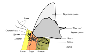 РИСУНОК БАБОЧКИ С ОПИСАНИЕМ ВСЕХ ЧАСТЕЙ: 1- брюшко