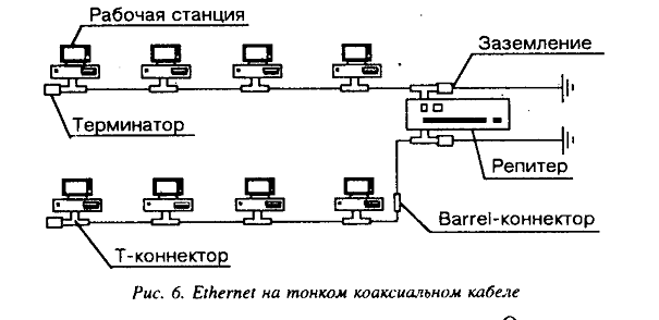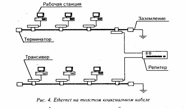 На рис. 4 схематически изображена локальная сеть на основе толстого коаксиального кабеля.