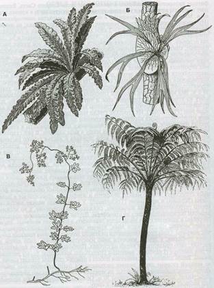 Рис. 1 - Жизненные формы папоротников: А, Б - эпифитные папоротники - асплениум гнездовый (Asplenium nidus); платацериум (Р1аcerium); В - листовая лиана лигодиум (Lygodium); Г - древовидная форма