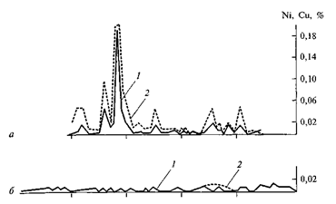 Рис. 5. Распределение концентраций никеля и меди в озоленном веществе горизонта железо-иллювиального подзола (а), в нижней части почвы (б) и в рыхлой почвообразующей породе (в) надмедно-никелевым рудопроявлением Нюдуайвенч; разрез по скважине 720 (г): 1 – концентрация меди; 2 – концентрация никеля