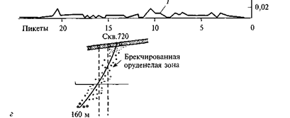 На рис. 5 показаны результаты определения концентрации меди и никеля в почве и рыхлых отложениях, отобранных с определенных глубин по профилю, пересекающему участок рудопроявления Нюдуайвенч (Кольский полуостров). Установлено, что концентрация металлов в озоленном веществе лесной подстилки (горизонт A0 иллювиально-железистого подзола) сильно возрастает над рудной зоной, в то время как в пробах, взятых с большей глубины – в нижней части почвенного профиля и почвообразующей породе (моренных отложениях) – аномальных концентраций металлов не обнаружено.