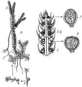Рисунок 5. Селагинелла обыкновенная: А – спорофит: 1 – придаточный корень, 2 – стебель с листьями, 3 – стробил, 4 – молодойспорофит; Б – стробил со спорангиями: 5 – микроспорангий, 6 – мегаспорангий, 7– микроспора, 8 – мегаспора