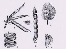 Примеры плодов бобовых (рисунок 8): 1 – типичный плод вики, 2 – разламывающийся боб копеечника, 3 – спирально закрученный боб люцерны, 4 – односемянной боб эспарцета, 5 – крылатый одно–двусемянной боб красного сандалового дерева.