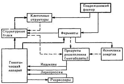 Биохимическая структура всякой клетки и ткани определяется информацией, заложенной в геноме клеток. Качественный состав и величина содержания структурных и ферментных белков определяются геномом, а интенсивность синтеза — условиями существования. В свою очередь состояние ферментных систем и изменения концентрации субстратов и продуктов реакций обмена веществ регулируют расходование и синтез белковых компонентов клетки. Однако в каждый данный момент возможности синтеза как белков, так и небелковых веществ реализуются не полностью. Синтез тех или иных белков может быть ограничен репрессированием определенных участков генома, но может усиливаться в результате дерепрессии или индукции, вызванной повышением функциональной активности клетки или повреждающего ее воздействия. Увеличение расщепления клеточных белков под влиянием изменения условий существования, а также концентрации продуктов обмена веществ, расходование небелковых веществ, снижение их концентрации, вызывая изменения активности ферментов, могут усиливать синтез этих веществ и повышать их концентрацию в клетке. Как видим, повреждающий фактор оказывает влияние на клеточные структуры и ферменты. Первые при этом в той или иной мере нарушаются, а вторые активируются. Под действием ферментов усиливается расходование источников энергии, а освободившиеся из клеточных структур белки в какой-то мере подвергаются расщеплению. Расщепляться при этом могут и сами ферменты. То и другое приводит к возрастанию концентрации метаболитов, которые нередко являются для генетического аппарата индукторами и дерепрессорами, т. е. способствуют отщеплению от гена репрессоров, ограничивающих синтез белков, и запускают процесс синтеза. В результате этого усиливается построение структурных и ферментных белков и восстанавливаются клеточные структуры.